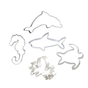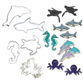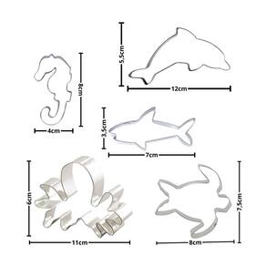 Tartaruga - 8cm x 7,5cm Cavalo marinho - 4cm x 8cm Tubarão - 7cm x 3,5cm Golfinho - 12cm x 5,5cm Polvo - 11cm x 6cm Espessura: 2cm Quantidade: 5 peças Composição: Aço Inox