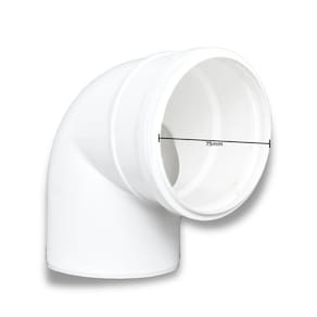 Material: PVC rígido resistente a agentes químicos. Dimensões: Diâmetro de 75mm com curvatura de 90 graus. Cor: Branco