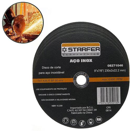 O Disco de Corte para Aço Inox da marca Starfer é uma ferramenta de alta qualidade projetada para cortes precisos em materiais de aço inoxidável. Com suas dimensões de 9 polegadas de diâmetro, 7/8 de polegada de furo central e 2mm de espessura, e uma velocidade máxima de 6.600 RPM a 80m/s, atende às normas NBR 15.230, garantindo qualidade e segurança. Ideal para aplicações industriais e profissionais, oferece cortes eficientes e limpos, sendo uma escolha confiável para projetos que exigem resultados excepcionais em corte de aço inoxidável.CARACTERÍSTICAS TÉCNICAS:Medidas: 9" x 7/8" - 230mm (diâmetro) x 22,2mm (diâmetro do furo) x 2,0mm (espessura)Rotação máxima: 6.600RPM - 80m/sNBR 15.230Quantidade: 5 unidadesRef.: 8271046Marca.: Starfer