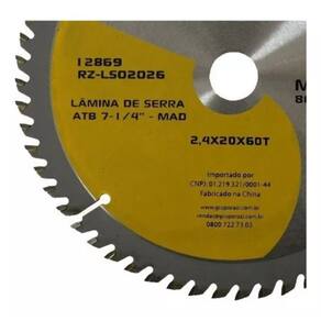 Marca: Razi Modelo: RZ-LS02024 Tamanho (mm): 7-1/4" Dentes: 24 Tipo: atb 15º Furo: 20MM Espessura: 2,4 Altura: 03 cm Largura: 21 cm Comprimento: 24 cm Peso: 300g