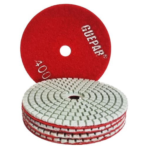 Jogo com 5 Discos Diamantados Flexível Brilho dÁgua 100mm Polimento Lixa Grão 400 Guepar - Marca: Guepar - Referência: 861-03296 - Diâmetro: 100mm - Furo: 22,2mm - Espessura: 4mm - É indicado para uso em esmerilhadeira angular para acabamento/ polimento de mármore, granito e pedras naturais. - Necessita de suporte para fixação com base aderente não acompanha - : 90 dias Marca: Não Informado Ean: 7734625972796