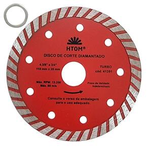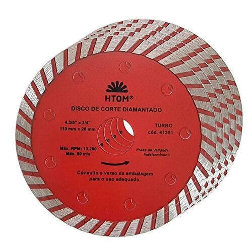 Kit com 5 Discos de Corte Diamantado Turbo 110mm x 20mm HTOM Disco de Corte Diamantado Turbo 110mm indicado para corte com Serra Mármore Makita . Corte a seco ou úmido em concreto baixo mármore, basalto, MPA, alvenaria, tijolo, granito, telha, ardósia e cerâmica. - Marca: HTOM - Referência: HTOM-41391-5X - Kit exclusivo com 5 discos turno para serra mármore - Diâmetro: 110 mm - Furo: 20mm - Acompanha anel para 16mm - Altura da borda de corte: 2.2mm - Largura da borda de corte: 8.5mm - Espessura: 1.8mm - Rotação máxima: 13.200 rpm - Combina cortes rápidos e acabamento - Corte a seco ou úmido refrigerado - Indicador para corte sem água em Concreto baixo MPA, alvenaria, tijolo, telha, ardósia e cerâmica - Indicado para corte com água em concreto alto MPA, mármore e granito. - Use sempre EPI - Peso: 95 gramas - : 90 dias