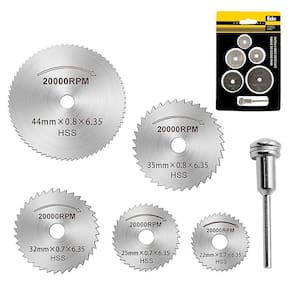 Kit de discos de corte para madeira / lâminas de serra para micro retíficas. Acompanha 5 lâminas de corte de 22 a 44mm e 1 haste de 3mm
