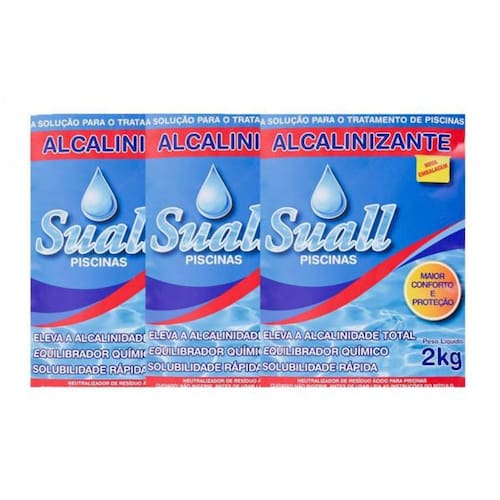 Kit 5 Elevador De Alcalinidade Bicarbonato De Sódio O Elevador de Alcalinidade é indicado para recompor o balanceamento da Alcalinidade total da água da piscina, ideal para piscinas de azulejo, fibra ou vinil, estabilizando a alcalinidade da água, gerando assim maior economia no tratamento da água. Aplicação do Elevador de Alcalinidade: 1 - Meça a alcalinidade total que deverá estar entre 80 a 120 ppm; 2 - Se estiver abaixo do 80 ppm, proceder conforme instruções a seguir. 3 - Adicione 17g de Elevador de Alcalinidade para cada 1000 litros de água. Essa dosagem aumentará a alcalinidade total em aproximadamente 10 ppm. 4 - Dissolva pouco a pouco a dosagem recomendada do produto num balde com água da piscina e espalhe de maneira uniforme sobre toda sua extensão. 5 - Filtre por um período entre 3 a 6 horas. Consulte o fabricante do filtro para saber o tempo ideal. 6 - Meça novamente a alcalinidade total. Caso necessário, repita o procedimento. Validade: 12 meses após a data de fabricação. Itens inclusos: 5 Sacos de elevador de alcalinidade 2kg Suall Ean: 7898661622777