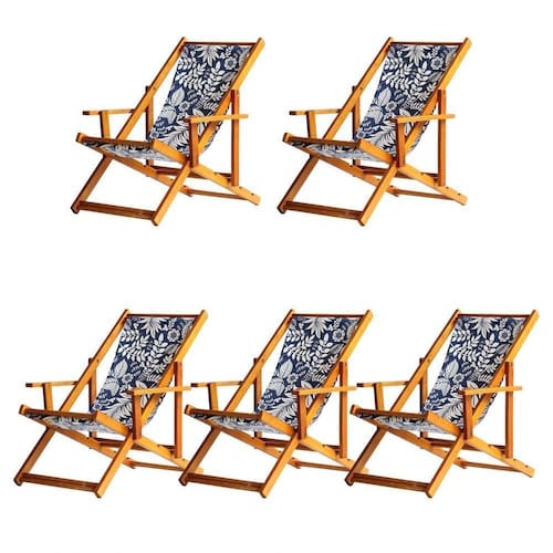 Kit 5 Espreguiçadeira Preguiçosa Dobrável Mel Cb-folhas Brancas 5 ESPREGUIÇADEIRAS ENVERNIZADA MEL C/BSabe aquele final de tarde que você tanto espera para tirar um descanso merecido? Ou aquela viagem para a praia programada a meses com a família? Pois é, nossas cadeiras espreguiçadeira serve exatamente para esses momentos, com várias opções de cores, os tecidos além de charmosos são hidro-repelentes e se adequam a qualquer ambiente, facilmente removíveis para higienização.Estrutura 100% de madeira maciça de ótima qualidade, a espreguiçadeira é totalmente dobrável e reclinável (4 posições de ângulo), com descanso para braço, sendo possível montar invertida sem o encosto de braço, perfeita para seu lazer em todos os ambientes, esse é o item que definitivamente não pode faltar na vida de quem de fato, quer aproveitar bons momentos! FICHA TÉCNICA DO PRODUTO:04 Níveis de Regulagem de Altura;Tecido Reforçado;Fabricada em Madeira Maciça Pinus;Peso aproximado: 7,5 Kg;Suporta aproximadamente 120 kg;Cor da Madeira: Mel Dimensões aproximadas do Produto:Altura 1: 69 cm;Altura 2: 82 cm;Altura 3: 91 cm;Altura 4: 100 cm;Profundidade: 105 cm. Dimensão aproximada total:Comprimento: 135 cm;Largura: 66 cm; Informações Adicionais:Garantia: 90 dias contra defeitos de fabricação.Acompanha 5 cadeiras Obs. A cor pode variar da foto conforme a tonalidade da madeira e iluminação.. !! Marca: Brasil Móveis