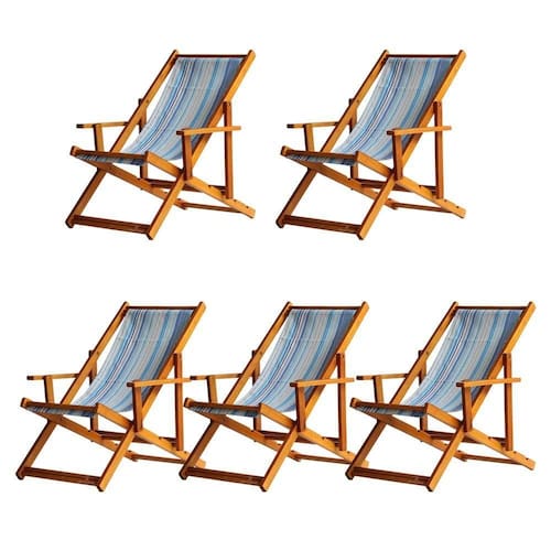 Kit 5 Espreguiçadeira Preguiçosa Dobrável Mel Cb-listras Azuis 5 ESPREGUIÇADEIRAS ENVERNIZADA MEL C/BSabe aquele final de tarde que você tanto espera para tirar um descanso merecido? Ou aquela viagem para a praia programada a meses com a família? Pois é, nossas cadeiras espreguiçadeira serve exatamente para esses momentos, com várias opções de cores, os tecidos além de charmosos são hidro-repelentes e se adequam a qualquer ambiente, facilmente removíveis para higienização.Estrutura 100% de madeira maciça de ótima qualidade, a espreguiçadeira é totalmente dobrável e reclinável (4 posições de ângulo), com descanso para braço, sendo possível montar invertida sem o encosto de braço, perfeita para seu lazer em todos os ambientes, esse é o item que definitivamente não pode faltar na vida de quem de fato, quer aproveitar bons momentos! FICHA TÉCNICA DO PRODUTO:04 Níveis de Regulagem de Altura;Tecido Reforçado;Fabricada em Madeira Maciça Pinus;Peso aproximado: 7,5 Kg;Suporta aproximadamente 120 kg;Cor da Madeira: Mel Dimensões aproximadas do Produto:Altura 1: 69 cm;Altura 2: 82 cm;Altura 3: 91 cm;Altura 4: 100 cm;Profundidade: 105 cm. Dimensão aproximada total:Comprimento: 135 cm;Largura: 66 cm; Informações Adicionais:Garantia: 90 dias contra defeitos de fabricação.Acompanha 5 cadeiras Obs. A cor pode variar da foto conforme a tonalidade da madeira e iluminação.. !! Marca: Brasil Móveis