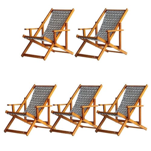 Kit 5 Espreguiçadeira Preguiçosa Dobrável Mel Cb-retro 5 ESPREGUIÇADEIRAS ENVERNIZADA MEL C/BSabe aquele final de tarde que você tanto espera para tirar um descanso merecido? Ou aquela viagem para a praia programada a meses com a família? Pois é, nossas cadeiras espreguiçadeira serve exatamente para esses momentos, com várias opções de cores, os tecidos além de charmosos são hidro-repelentes e se adequam a qualquer ambiente, facilmente removíveis para higienização.Estrutura 100% de madeira maciça de ótima qualidade, a espreguiçadeira é totalmente dobrável e reclinável (4 posições de ângulo), com descanso para braço, sendo possível montar invertida sem o encosto de braço, perfeita para seu lazer em todos os ambientes, esse é o item que definitivamente não pode faltar na vida de quem de fato, quer aproveitar bons momentos! FICHA TÉCNICA DO PRODUTO:04 Níveis de Regulagem de Altura;Tecido Reforçado;Fabricada em Madeira Maciça Pinus;Peso aproximado: 7,5 Kg;Suporta aproximadamente 120 kg;Cor da Madeira: Mel Dimensões aproximadas do Produto:Altura 1: 69 cm;Altura 2: 82 cm;Altura 3: 91 cm;Altura 4: 100 cm;Profundidade: 105 cm. Dimensão aproximada total:Comprimento: 135 cm;Largura: 66 cm; Informações Adicionais:Garantia: 90 dias contra defeitos de fabricação.Acompanha 5 cadeiras Obs. A cor pode variar da foto conforme a tonalidade da madeira e iluminação.. !! Marca: Brasil Móveis