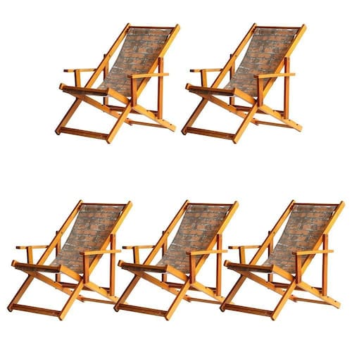Kit 5 Espreguiçadeira Preguiçosa Dobrável Mel Cb-tijolo 5 ESPREGUIÇADEIRAS ENVERNIZADA MEL C/BSabe aquele final de tarde que você tanto espera para tirar um descanso merecido? Ou aquela viagem para a praia programada a meses com a família? Pois é, nossas cadeiras espreguiçadeira serve exatamente para esses momentos, com várias opções de cores, os tecidos além de charmosos são hidro-repelentes e se adequam a qualquer ambiente, facilmente removíveis para higienização.Estrutura 100% de madeira maciça de ótima qualidade, a espreguiçadeira é totalmente dobrável e reclinável (4 posições de ângulo), com descanso para braço, sendo possível montar invertida sem o encosto de braço, perfeita para seu lazer em todos os ambientes, esse é o item que definitivamente não pode faltar na vida de quem de fato, quer aproveitar bons momentos! FICHA TÉCNICA DO PRODUTO:04 Níveis de Regulagem de Altura;Tecido Reforçado;Fabricada em Madeira Maciça Pinus;Peso aproximado: 7,5 Kg;Suporta aproximadamente 120 kg;Cor da Madeira: Mel Dimensões aproximadas do Produto:Altura 1: 69 cm;Altura 2: 82 cm;Altura 3: 91 cm;Altura 4: 100 cm;Profundidade: 105 cm. Dimensão aproximada total:Comprimento: 135 cm;Largura: 66 cm; Informações Adicionais:Garantia: 90 dias contra defeitos de fabricação.Acompanha 5 cadeiras Obs. A cor pode variar da foto conforme a tonalidade da madeira e iluminação.. !! Marca: Brasil Móveis
