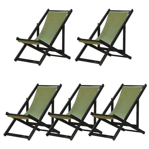 Kit 5 Espreguiçadeiras Dobrável Black Sb-verde 5 ESPREGUIÇADEIRAS ENVERNIZADAS BLACK S/BSabe aquele final de tarde que você tanto espera para tirar um descanso merecido? Ou aquela viagem para a praia programada a meses com a família? Pois é, nossas cadeiras espreguiçadeira serve exatamente para esses momentos, com várias opções de cores, os tecidos além de charmosos são hidro-repelentes e se adequam a qualquer ambiente, facilmente removíveis para higienização.Estrutura 100% de madeira maciça e verniz especial, que garante sua qualidade e durabilidade, a espreguiçadeira é totalmente dobrável e reclinável (4 posições de ângulo), perfeita para seu lazer em todos os ambientes, seja ele externo ou interno, esse é o item que definitivamente não pode faltar na vida de quem de fato, quer aproveitar bons momentos! FICHA TÉCNICA DO PRODUTO:04 Níveis de Regulagem de Altura;Tecido Reforçado;Fabricada em Madeira Maciça Pinus;Peso aproximado: 7,5 Kg;Suporta aproximadamente 120 kg;Cor da Madeira: PretaAcabamento: Envernizada Dimensões aproximadas do Produto:Altura 1: 69 cm;Altura 2: 82 cm;Altura 3: 91 cm;Altura 4: 100 cm;Profundidade: 105 cm. Dimensão aproximada total:Comprimento: 135 cm;Largura: 60 cm; Informações Adicionais:Garantia: 90 dias contra defeitos de fabricação.Acompanha 5 cadeiras Obs. A cor pode variar da foto conforme a tonalidade da madeira e iluminação..