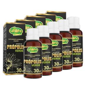 Kit 5 Extrato de Própolis Verde Unilife 30ml Sobre o produto EXTRATO PRÓPOLIS VERDE Unilife Vitamins Desenvolvido a partir de extrato de própolis verde em pó, o produto é livre de glúten Modo de usar 1 gota ao dia. Ingredientes Extrato de própolis 20%, ácido ascórbico, bisglicinato de zinco, selenometionina, antiumectantes: silicato de magnésio, estearato de magnésio e dióxido de silício. Marca: Não Informado