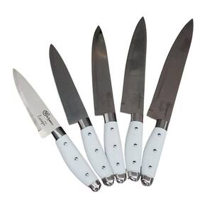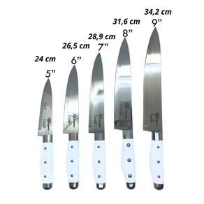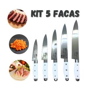 Kit 5 facas de cortar carne master chef cozinha churrasco gourmet Kit com 5 facas de cozinha de 5 à 9 polegadas cabo branco Marca: sq Contem:1 faca 5' - tamanho total: 24,0cm, lâmina 12,8cm e cabo 11,2cm.1 faca 6' - tamanho total: 26,5cm, lâmina 15,3cm e cabo 11,2cm.1 faca 7' - tamanho total: 29,0cm, lâmina 17,8cm e cabo 11,2cm.1 faca 8' - tamanho total: 32,0cm, lâmina 20,8cm e cabo 11,2cm.1 faca 9' - tamanho total: 34,0cm, lâmina 22,8cm e cabo 11,2cm. Lâmina em aço inox com 1,2mm de espessura; Tratamento térmico total; Indicada para cortar e fatiar carnes, legumes e verduras; Cabo injetado em polipropileno fixados por rebites de alumínio; Ponta do cabo reforçada com capsula de aço para auxiliar na quebra de cascas; Reforço de aço na parte de baixo do cabo garantindo maior fixação e resistência.