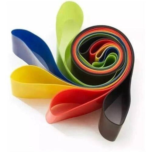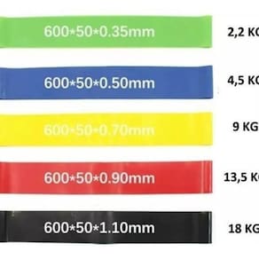 Kit 5 Faixas Elásticas Thera Band Exercícios Em Casa Conjunto com 5 mini bands é de látex de alta qualidade e possui 5 níveis de resistência: Ultra Leve (Verde), Leve (Azul), Médio (Amarela), Forte (Vermelha) e Ultra Forte (Preta). Cada mini band tem 30cm de comprimento e 5cm de largura O kit de mini bands é indicado tanto para iniciantes, que podem ir evoluindo gradualmente e aumentando o nível de resistência, mas também para quem já treina usando níveis de resistência de intermediário à forte. Descrição das resistências do Kit: Ultra leve ou Verde = equivale a 2,2kg Azul ou Leve = equivale a 4,5kg Amarela ou Média = equivale a 9kg Vermelha ou Forte =equivale a 13,5kg Preta ou Ultra Forte = equivale a 18kg