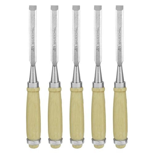 Kit 05 Formões Tradestar de 1/2 Polegada Elevando o padrão em ferramentas manuais, a Tradestar traz para você o Formão de 1 polegada, uma ferramenta meticulosamente projetada para entalhes, esculturas e outros trabalhos em madeira. Características principais: Corte Preciso: Com uma largura de 1/2 polegada, este formão é ideal para entalhes amplos e detalhados, garantindo cortes limpos e precisos. Aço de Alta Qualidade: Construído com aço resistente, assegura uma borda afiada e uma longa vida útil da lâmina, resistindo a desgastes comuns do dia a dia. Design Ergonômico: O cabo foi projetado pensando no conforto e na segurança, permitindo um manuseio firme e diminuindo a fadiga durante o uso prolongado. Durabilidade Tradestar: Como todos os produtos da marca, este formão é feito para durar, apresentando resistência e confiabilidade em todos os trabalhos. Multifuncional: Perfeito para marcenaria, carpintaria e outros projetos de madeira. Aplicações sugeridas: Excelente para entalhes em madeira, criação de juntas e acabamentos. Ideal para artesãos, marceneiros e entusiastas do DIY. Ferramenta essencial para oficinas e ateliês. Com o Formão Tradestar de 1/2 polegada, você terá em mãos uma ferramenta que não só atende, mas supera as expectativas em termos de performance e durabilidade. Uma adição valiosa para qualquer conjunto de ferramentas. DETALHES IMPORTANTES Confira algumas vantagens de comprar com a JJC FERRAMENTAS: 90 dias após a compra. Imagens meramente ilustrativas As tonalidades da cor do produto podem sofrer alterações de acordo com a tela que estiver usando para visualização. do vendedor: 90 dias Marca: Tradestar