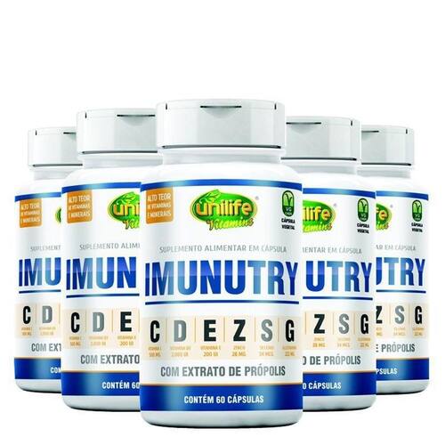 Kit 5 imunutry zinco, selênio, glutamina, própolis e vitaminas c, d e e unilife 60 cápsulas Desenvolvido a partir de vitamina c 500 mg, vitamina d3 2.000 ui, vitamina e 200 ui, zinco 28 mg, selênio 34 mcg, glutamina 222mg e extrato de própolis, com cápsula vegetal gelatina vegetal e água , o produto é livre de glúten e lactose e está disponível na versão: 60 cápsulas. Você o encontra nas melhores lojas de produtos naturais/farmácias ou e-commerces lojas virtuais . Modo de ingestão: sugere-se a ingestão de 1 cápsula 2 vezes ao dia. Ingerir com líquido. Peso total da cápsula: 700mg 500 mg de vitamina c, 2.000 ui de vitamina d3, 200 ui de vitamina e, 28 mg de zinco, 34 mcg de selênio e 222 mg de glutamina na porção de 2 cápsulas Marca: Não Informado