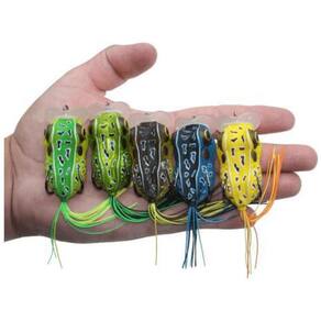 Kit 5 Isca Artificial Pesca Frog Sapo Anti Enrosco + Estojo As iscas são feitas de silicone, resistentes e macias. Sua ação é de superfície e possui barriga achatada para deslizar sobre as estruturas, possui anzol anti enrosco. São excelentes para serem usadas em locais com vegetação aquática abundante, muitos galhos, troncos, pedras, etc. Possuem 2 anzóis extremamente afiados. Ideal na pescaria de traira, trairão, pacu, black bass, tucunaré, entre os vários outros peixes predadores que investem sobre iscas em movimento. Especificações: Comprimento: 5cm Peso: 13gr