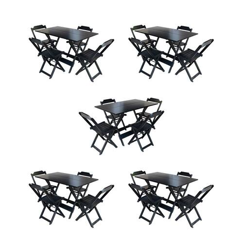 Kit 5 Jogos de Mesa Dobravel com 4 Cadeiras de Madeira 120x70 para Restaurante e Bar - Preto - Preto