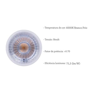 - base: gu10 - formato: mr16 - temperatura de cor: 6000k branco frio - tensão: bivolt - potência: 6w - fator de potência: 0.70 - fluxo luminoso: 429lm - eficiência luminosa: 71,5lm/w - ângulo de abertura: 38 - vida útil : 25.000 horas - temp. De operação: -20c 40c Ean: 7891072777746