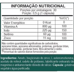Amido, bisglicinato de Zinco, L-selenometionina, acetato de retinol, iodeto de potássio, lubrificante estearato de magnésio e antiumectante dióxido de silício. Cápsula: gelatina vegetal e água purificada.