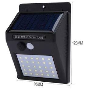 Especificações: Painel Solar: 0.55 w, 17% eficiência Bateria recarregável: 3.7 V 800 mAh Quantidade de LED: 30 LEDs Potência: 0.2 W/LED Material: ABS + PC Classe da proteção: IP65 Tempo de carregamento: 6 ~ 8 h Tamanho da luminária: 9,5 x 12,3