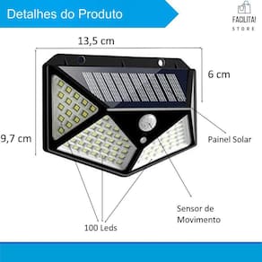 Material: ABS Cor da Luz: Branco Frio Leds: 100 Bateria: 5.5V 1800mAh Painel Solar: 5.5V/1.0W Distância de Detecção: 3 a 5 metros Dimensões: Altura 5cm x Largura 13.5cm x Altura 10cm Peso: 150g
