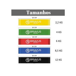 Kit 5 mini bands com sacolinha de transporte bravus sport O conjunto com 5 mini bands é de látex de alta qualidade e possui 5 níveis de resistência: ultra leve, leve, médio, forte e ultra forte. As mini bands podem ser usadas juntas ou em separado, permitindo que você tenha diversos tipos de resistência. Cada mini band tem 30cm de comprimento e 5cm de largura. O kit de mini bands é inidicado tanto para iniciantes, que podem ir evoluindo gradualmente e aumentanto o nível de resistência, mas também para quem já treina usando níveis de resistência de intermediário à forte. Cada mini band tem uma resistência diferente ao ser esticada:Ultra leve = equivale a 2,2kgLeve = equivale a 4kgMédia = equivale a 6kgForte =equivale a 8,5kgUltra forte = equivale a 12kg