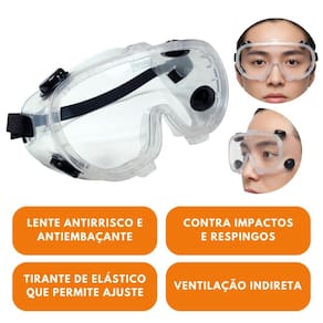 Óculos de segurança ampla-visão que garantem proteção total e conforto. Possuem armação em PVC incolor com ventilação indireta, visor em policarbonato resistente e tirante elástico ajustável. Oferecem excelente visibilidade, evitam o embaçamento e protegem toda a região dos olhos contra impactos e respingos.
