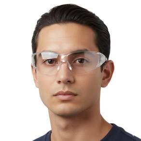 Óculos de proteção monobloco com amplo campo de proteção e proteções laterais, compatibilidade com protetores auriculares.