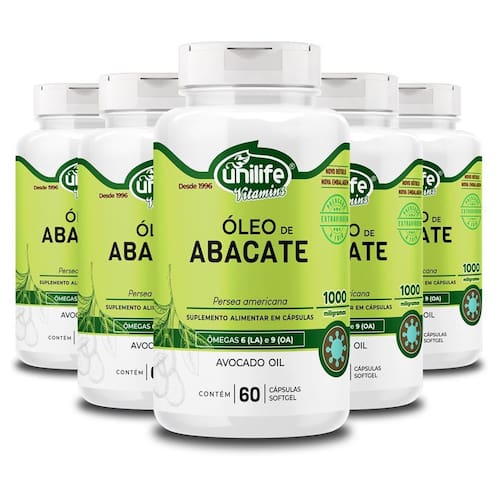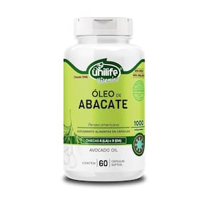 Óleo de abacate 60 cápsulas 1200mg - unilife O óleo de abacate unilife é um suplemento em cápsulas à base de óleo de abacate, que por sua vez é rico em gorduras do bem, como o ácido oleico ômega 9 , luteína, vitaminas e minerais. Além disso, é enriquecido com 4 vitaminas lipossolúveis a, d, e, k , que melhoram a absorção do produto. Benefícios do óleo de abacate: Contém ingredientes naturais; Oferece 100% da recomendação de ingestão diária de vitamina e em apenas uma porção; Oferece 50% da recomendação de ingestão diária das vitaminas a, d e k em apenas uma porção; Fácil e prático para o consumo; Modo de usar: Sugere-se a ingestão de 2 a 4 cápsulas ao dia, após a principal refeição. Ingerir com líquido. Ingredientes: Óleo de abacate, gelatina e umectante glicerina. Marca: Não Informado