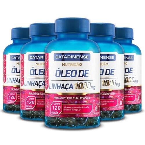 Kit 5 Óleo de Linhaça 1000mg Catarinense 120 cápsulas Sabe-se que a semente de linhaça é um alimento que contém ácido alfa linolênico ômega 3 . O óleo extraído de sua semente é constituído de aproximadamente 55% de ácido alfa linolênico, ácido graxo que pertence ao grupo dos ômega 3. Recomendação de uso: 2 cápsulas ao dia. Ingerir com líquido. Ingredientes: Óleo de linhaça e água. Gelificante gelatina INS 428 , umectante glicerina INS 422 . Não contém glúten. Zero açúcares. Zero lactose. Marca: Não Informado