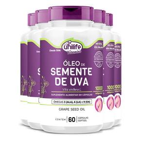 Kit 5 óleo de semente de uva 1200mg unilife 60 cápsulas O óleo da semente de uva é um dos tipos de óleos vegetais prensados a frio. Esse tipo de extração de óleo é o mais demorado e também o mais oneroso de todos os processos. As sementes contidas nos frutas passam pro uma prensagem até que delas seja extraído um óleo 100% puro, que possui uma qualidade altíssima, preservando todas as propriedades nutricionais e medicinais dos produtos. Para se extrair 1 litro do óleo da semente de uva é necessário uma quantidade total de 30 quilos de sementes da uva.
