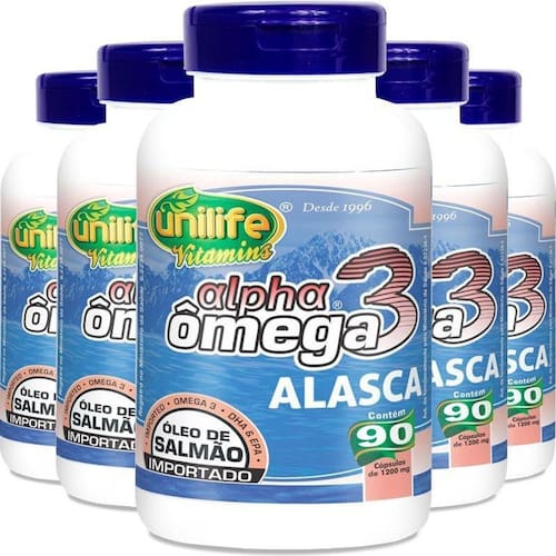 Kit 5 Ômega 3 Alpha Óleo de Salmão 1200mg 90 cápsulas Unilife O Alpha Ômega 3 Óleo de Salmão Unilife Vitamins é um suplemento alimentar BIOKOSHER, desenvolvido a partir da extração do óleo de salmão selvagem, de águas profundas e frias do ALASCA. Características: - Fonte de Ômega 3. - Óleo de Salmão. Modo de Uso: Sugere-se a ingestão de 1 cápsula 2 vezes ao dia, junto as principais refeições. Ingerir com líquido. Ingredientes: Óleo de peixe salmão. Cápsula: gelatina bovina, umectante glicerina e água purificada. Avisos: - Este produto não é um . - Não exceder a recomendação diária de consumo indicada na embalagem. - Manter fora do alcance de crianças. Marca: Não Informado