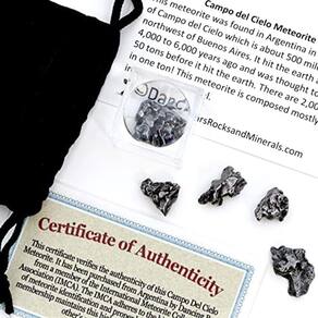 Este kit científico inclui 5 pcs de meteoritos genuínos, uma caixa de ampliação de uma polegada, um cartão de informações educacionais, certificado de autenticidade e uma bolsa de veludo. Os meteoritos medem aproximadamente 3/8- 1/2 polegada. Esses meteoritos caíram há mais de 4000 anos! Estes meteoritos foram encontrados na área do Campo del Cielo, na Argentina. Estima-se que o meteorito pesava mais de 50 toneladas antes de atingir a Terra (há 2.200 libras em uma tonelada)! Os meteoritos são compostos principalmente de ferro com um pouco de níquel. Cada kit é montado por nossa equipe dedicada em Eugene, OR nos EUA Comprar este kit suporta muitas grandes causas, pois doamos 10% de nossos lucros para instituições de caridade em todo o mundo! Dancing Bear tem orgulho de fornecer aos nossos clientes uma garantia de satisfação de 100%. Se você não estiver completamente satisfeito, vamos reembolsar com prazer o seu dinheiro mais o envio. O transporte é rápido e é enviado pelo correio prioritário.