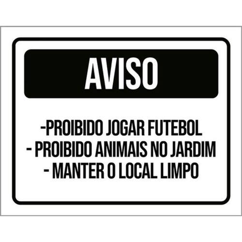 Kit 5 Placa Proibido Jogar Futebol Animais Jardim Limpo36x46 - Informações do Produto: Placas decorativas fabricadas com poliestireno de alto impacto PSAI de 2mm e impressão ultravioleta. - Medidas: 36cm x 46cm - Fixação: Todas as placas possuem adesivo dupla face para aplicação em qualquer tipo de superfície lisa. de 12 meses e disponibilidade imediata. Marca: Não Informado