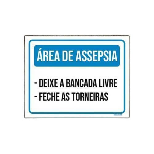 Kit 5 Placas Área Assepsia Bancada Livre Feche Torneiras - Informações do Produto: Kit com 5 placas decorativas iguais fabricadas com poliestireno de alto impacto PSAI de 2mm e adesivo vinil automotivo de alta performance. - Medidas: 18cm x 23cm - Fixação: Todas as placas possuem adesivo dupla face para aplicação em qualquer tipo de superfície lisa. Garantia de 12 meses e disponibilidade imediata. Marca: Sinalizo