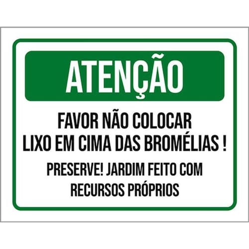 Kit 5 Placas Atenção Não Colocar Lixo Nas Bromélias 36x46 Placas de sinalizaço fabricadas com poliestireno de alto impacto PSAI de 2mm e impressão ultravioleta.