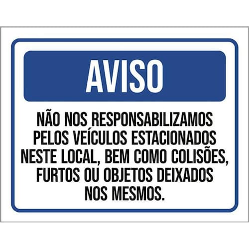 Kit 5 Placas Aviso Não Responsabilizamos Veículos 36x46 Placas de sinalizaço fabricadas com poliestireno de alto impacto PSAI de 2mm e impressão ultravioleta.