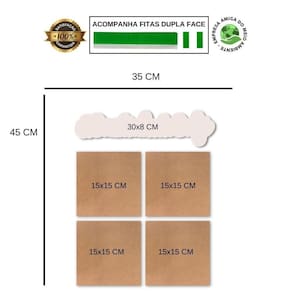 Tamanhos: 1 Placa Recorte Cantinho 30x8 cm (Plástico) e 4 Placas 15x15 cm (MDF).