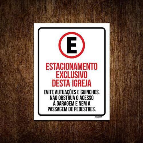 Kit 5 Placas - Estacionamento Exclusivo Igreja - Informações do Produto: Placas decorativas fabricadas com poliestireno de alto impacto PSAI de 2mm e adesivo vinil automotivo de alta performance. - Medidas: 36cm x 46cm - Fixação: Todas as placas possuem adesivo dupla face para aplicação em qualquer tipo de superfície lisa. Garantia de 12 meses e disponibilidade imediata. Marca: Sinalizo.Com