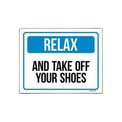 Kit 5 Placas Sinalização - Relax And Take Off Your Shoes - Informações do Produto: Placas decorativas fabricadas com poliestireno de alto impacto PSAI de 2mm e adesivo vinil automotivo de alta performance. - Medidas: 18cm x 23cm - Fixação: Todas as placas possuem adesivo dupla face para aplicação em qualquer tipo de superfície lisa. de 12 meses. Marca: Sinalizo.Com