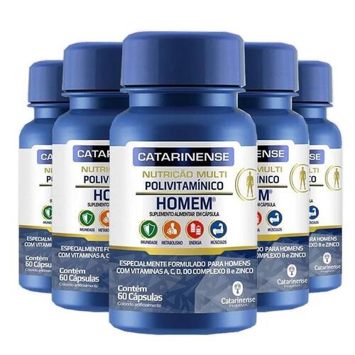 Kit 5 Polivitamínico Homem Catarinense 60 cápsulas Homem foi desenvolvido com base nas necessidades nutricionais específicas dos Homens. Sua composição de nutrientes foi cuidadosamente escolhida de modo a complementar a ingestão de vitaminas e minerais, essenciais para a saúde e o bem-estar dos homens. Não engorda e não contém glúten. Ingestão Recomendada Recomenda-se ingerir 1 cápsula ao dia, que atende a Ingestão Diária Recomendada IDR descrita na tabela de Informação Nutricional. Deve ser ingerido com líquido. Marca: Não Informado