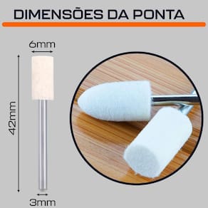Kit 5 Ponta Montada de Feltro 6mm Cilíndrica Haste 3mm para Polimento com Micro Retíficas Dremax - Marca: Dremax - Jogo exclusivo com 5 pontas montadas - Diâmetro da Ponta: 6mm - Comprimento: 42mm - Diâmetro da haste das pontas: 3mm - Indicado para polimentos - Formato: Cilíndrica - Uso em micro retíficas de qualquer marca que suporte prender hastes de 3mm - Para polir metais e plásticos em superfícies planas ou orifícios - Indicada para polimento de metais ferrosos ou não ferrosos, aço, aço inoxidável, alumínio, bronze, cobre, latão e plástico em geral - Garantia: 90 dias contra defeitos de fabricação A DREMAX é a primeira e única marca brasileira dedicada exclusivamente às micro retíficas, acessórios e acoplamentos para esta indispensável ferramenta. Seja para trabalhos de precisão, artesanato, modelagem ou reparos, a DREMAX tem o produto certo para você. Marca: Dremax