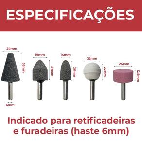 - Marca: Bravo Tools - Referência: BV1006 - Indicada para limpezas e acabamentos em superfícies - Diâmetro da haste: 6mm - 1 Ponta Cilíndrica Branca 22 x 22mm Grão Fino - 1 Ponta Tipo Roda Rosa 24 x 12,5mm Grão Médio - 1 Ponta Tipo Bala Cinza 16 x 26mm Grão Grosso - 1 Ponta Tipo Árvore Cinza 24 x 35mm Grão Grosso - 1 Ponta Tipo Cônica Cinza 19 x 27mm Grão Grosso - Material da ponta: Óxido de alumínio Corundum - As pontas montadas são indicadas para uso geral - Uso em retificadeiras e furadeiras de qualquer marca com mandril de 6mm - Indicada para afiação, esmerilhamento e desbaste em metais, joias, pedras preciosas, vidro, entre outros materiais - Ideal para trabalhos detalhados em uma variedade de superfícies, oferecendo remoção de material suave e precisa - Seu formato facilita o trabalho em locais de difícil acesso - Velocidade máxima: 25.000rpm - Peso bruto: 90 gramas - Garantia: 90 dias contra defeitos de fabricação Marca: Bravo Tools