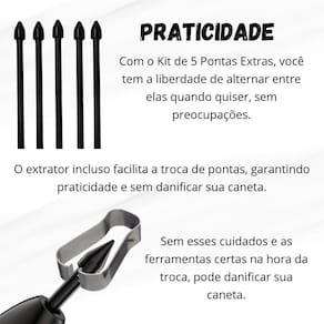 Kit 5 ponteira + 1 extrator para galaxy tab s10 fe 10.9 x526 Cores: preto cansado de comprometer seus traços Deseja uma solução para manter sua caneta sempre perfeita apresentamos o kit de 5 ponteiras de reposição garanta traços impecáveis, sem interferências, em cada escrita ou desenho. com o extrator incluso, trocar as pontas é mais simples do que nunca. Basta colocar e puxar para retirar. Precisa colocar novamente Repita o processo e volte a desenhar com perfeição. adquira o kit de 5 pontas extras e liberte sua criatividade troque entre as pontas quando quiser, sem medo de danificar sua caneta. ------------------ Atenção ------------------ Esse anúncio é referente a 5x pontas de canetas e 1x extrator Não acompanha caneta Acessórios que ambientam as fotos não inclusos. ------------------ ------------------ como funciona o extrator incluso no kit R: o extrator é simples de usar para retirar a ponta, basta colocá-lo na extremidade e puxar suavemente. Para colocar, repita o mesmo processo inserindo na caneta. posso usar essas ponteiras em tablets e celulares R: sim as ponteiras deste kit são projetadas para oferecer precisão e conforto em cada toque, sendo perfeitas para uso em tablets e celulares. o extrator danifica a ponta ou a caneta R: não, o extrator foi projetado para facilitar a troca de pontas sem danificar sua caneta. Com o extrator incluso, você pode trocar as pontas com praticidade e segurança. ------------------ Especificações ------------------ Altura ponta da caneta: 2 cm. Altura extrator: 3,2 cm Kit de 5 ponteiras de reposição 1 extrator incluso Ponteiras perfeitas para uso em tablets e celulares Troca fácil e rápida Evita danos à caneta Ideal para garantir traços impecáveis em desenhos e escritas Compatibilidade: linha s - samsung s10 fe 10.9 x526 x520 . - samsung s10 fe+ 13.1 x626 x620 . ----------------- Conteúdo ------------------ 5x ponteiras de reposição 1x extrator incluso Não acompanha caneta Acessórios que ambientam as fotos não inclusos. ------------------ Apresentação: ------------------ - qualidade garantida. - atendimento qualificado. - enviamos para todo o brasil. - compra garantida. - despachamos em até 1 dia útil após confirmação do pagamento Garantimos a devolução por arrependimento em até 7 dias, após o recebimento e de 15 dias contra defeitos de fabricação. Marca: Não Informado Ean: 7796546982292