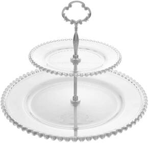 Garantia: 90 dias / Peso de cada: 1,966kg / Cor predominante: cristal / Ref: 7794463284260; Dimensões totais de cada: 32cm (D) x 32cm (L) x 25cm (A); Dimensões prato de cima: 19cm (D) x 19cm (C)x 2cm (A); Dimensões área de uso prato de cima: 13cm (D); Dimensões prato de baixo: 32cm (D) x 3cm (A); Dimensões área de uso prato de baixo: 20cm (D); Material: vidro cristal; Conteúdo: 5 porta doces dois andares.