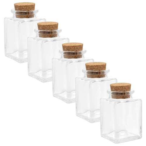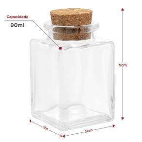 Características principais: - Kit 5 Potes de Vidro Quadrado com Tampa de Rolha de Cortiça. - Capacidade de 90ml. - Produzido em vidro resistente. - Medidas: 9cm x 5cm x 5cm altura x largura x profundidade .
