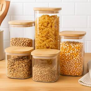 Conservação Superior: Cada pote de vidro conta com uma tampa de bambu com vedação hermética de silicone, que bloqueia totalmente a entrada de ar. Isso mantém o frescor, o aroma e a textura de grãos, massas, biscoitos e cafés como se tivessem sido abertos na hora.