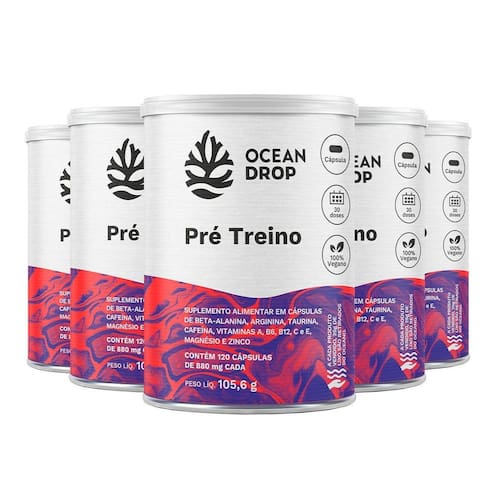 Kit 5 Pré-Treino Ocean Drop Vegano 120 Cápsulas Qual o diferencial do nosso pré-treino O Pré-Treino da Ocean Drop contém aminoácidos, como arginina, taurina e beta-alanina, além de cafeína, que ajuda a aumentar o estado de alerta, melhorar a concentração e otimizar o desempenho em exercícios físicos de resistência. Também possui vitaminas e minerais em suas formas ativas, que auxiliam no metabolismo energético, funcionamento muscular e outras funções vitais. Sua cápsula, feita de gelatina vegetal e água, é adequada para vegetarianos e veganos, bem como para aqueles que buscam um pré-treino livre de carboidratos, aditivos e conservantes Composição: - Cloridrato de L-arginina, bisglicinato de magnésio, taurina, amido, beta-alanina, cafeína 1,3,7-trimethylxanthine , ácido ascórbico, bisglicinato de zinco, acetato de DL-alfa-tocoferol, cloridrato de piridoxina, acetato de retinol, picolinato de cromo e metilcobalamina. - Cápsula de gelatina vegetal e água. - Não contém glúten. Modo de uso: - Sugere-se a ingestão de 4 cápsulas ao dia, de preferência antes de atividades físicas ou conforme recomendação . Contraindicações: - Indicado para pessoas acima de 19 anos. - Este produto não é um . - Contém cafeína; hipertensos devem consumir com atenção. Autorização: - Produto autorizado para comercialização em todo o território nacional através do anexo I da RDC 240/2018 da ANVISA. - AFE do MS 6.02234-1.