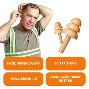 Protetor auditivo de inserção, do tipo prémoldado, injetado em silicone líquido, possui três flanges para vedação de ruído acompanha cordão. Extremamente macio para fácil acomodação no canal auditivo, tamanho único devido a sua maciez.