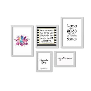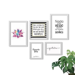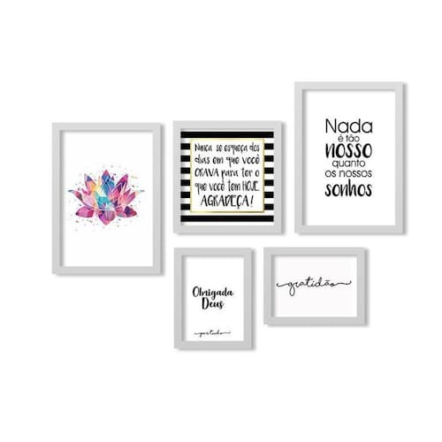 Kit 5 Quadros Decorativos Moldura Branca Lotus Agradeça Quadros decorativos fabricados com moldura de madeira de reflorestamento com acabamento laqueado, impressão a laser em papel couché 300g, fundo em madeira. As paredes ganham cor e vida com quadros e painéis decorativos. Escolha os modelos que faltam para deixar sua decoração ainda mais bonita. Na sala, no quarto ou em outros cômodos, as peças coloridas ou em preto e branco garantem mais estilo.