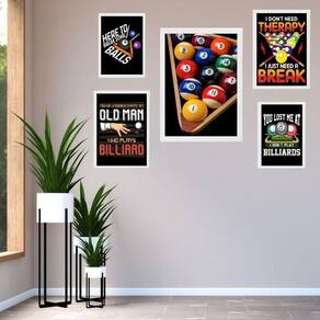 Kit 5 quadros decorativos sinuca - bilhar Moldura: madeira branca Informações do produto tire todas as suas dúvidas no descritivo abaixo: decoração para quarto, sala, cozinha, escritório, área gourmet e muito mais. Chega de paredes vazias medidas - kit composto por 5 quadros, sendo 2 quadros com medida 18x24cm, 2 quadros com 24x33cm e 1 quadro com medida 33x45cm. Material do papel - papel fotográfico brilhante de altíssima resolução acabamento - todos os quadros são acompanhados de uma película de acetato para proteção da imagem. - os quadros são embalados de forma segura com plástico bolha com camada dupla de acordo com o tamanho dos quadros. Garantia - garantia de 3 meses. Meu quadro chegou. Como posso fixá-lo Você precisa apenas de um martelo e um prego, pois os quadros já vão acompanhados de penduradores. Esta é a forma mais indicada. Caso prefira, você pode utilizar uma fita dupla face neste caso, sugerimos de alta qualidade para evitar que descole e seu quadro caia . Como posso limpar meu quadro A limpeza é feita como um móvel comum da sua casa. Apenas um pano seco ou espanador são suficientes para tal